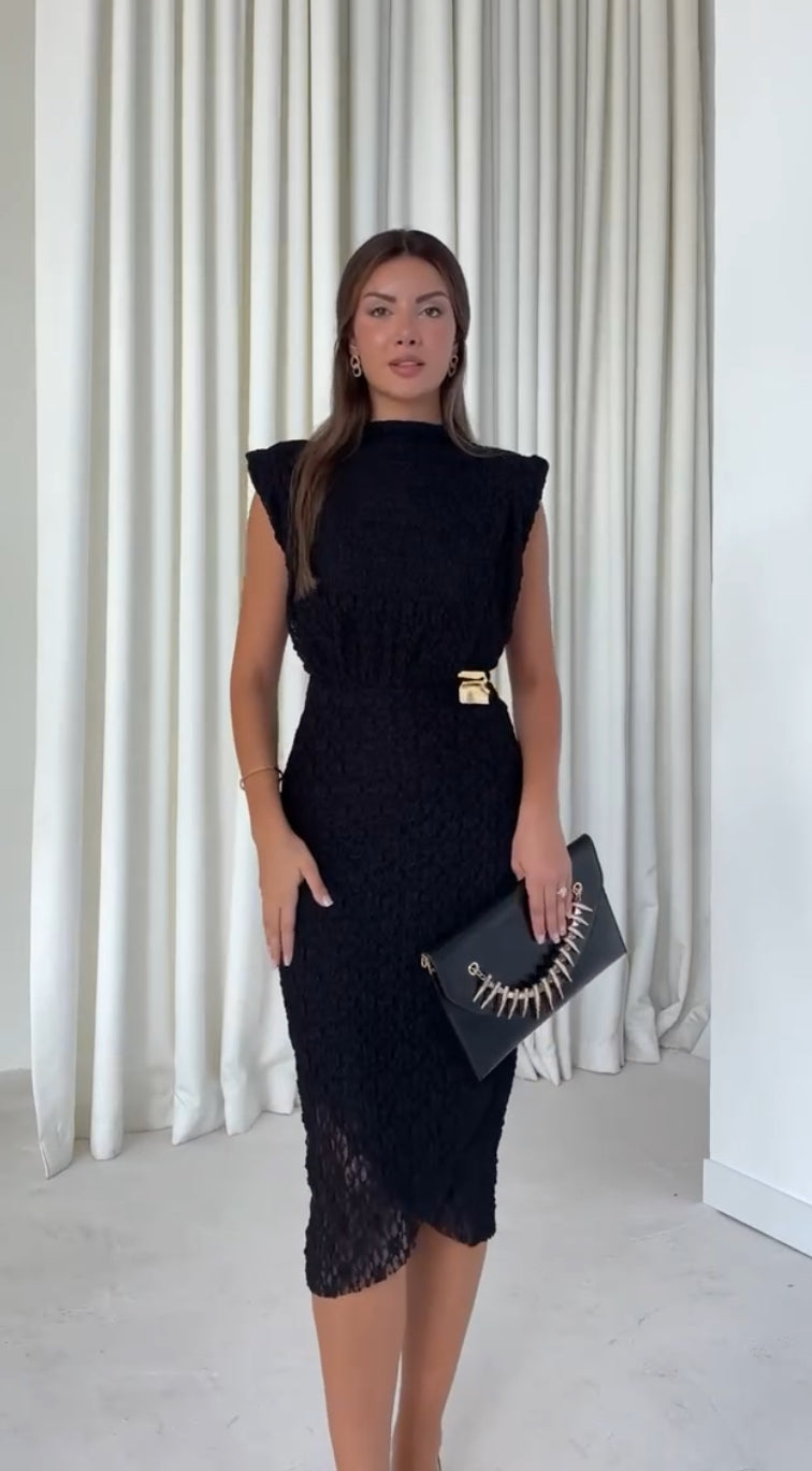 abito midi giromanica in pizzo con dettaglio dorato