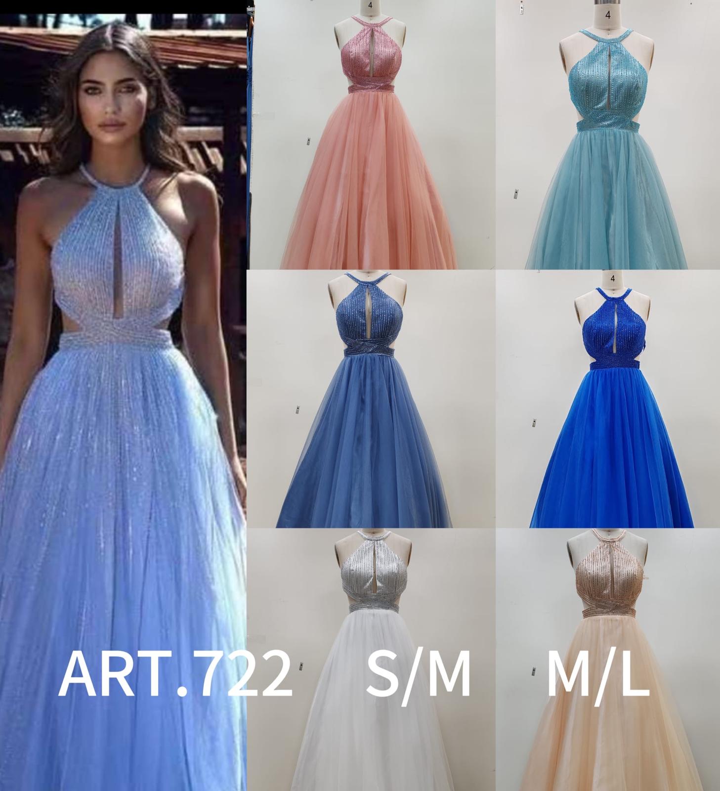 Abito da cerimonia con coretto in pailliettes con apertura e gonna in tulle ampia.