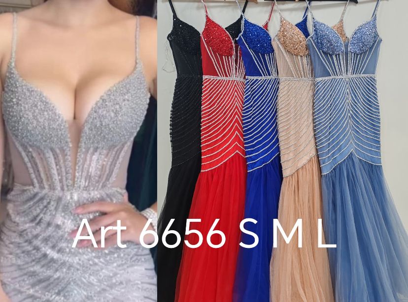 Abito lungo da cerimonia a sirena in tulle lavorato con strass, pailliette e perline.
