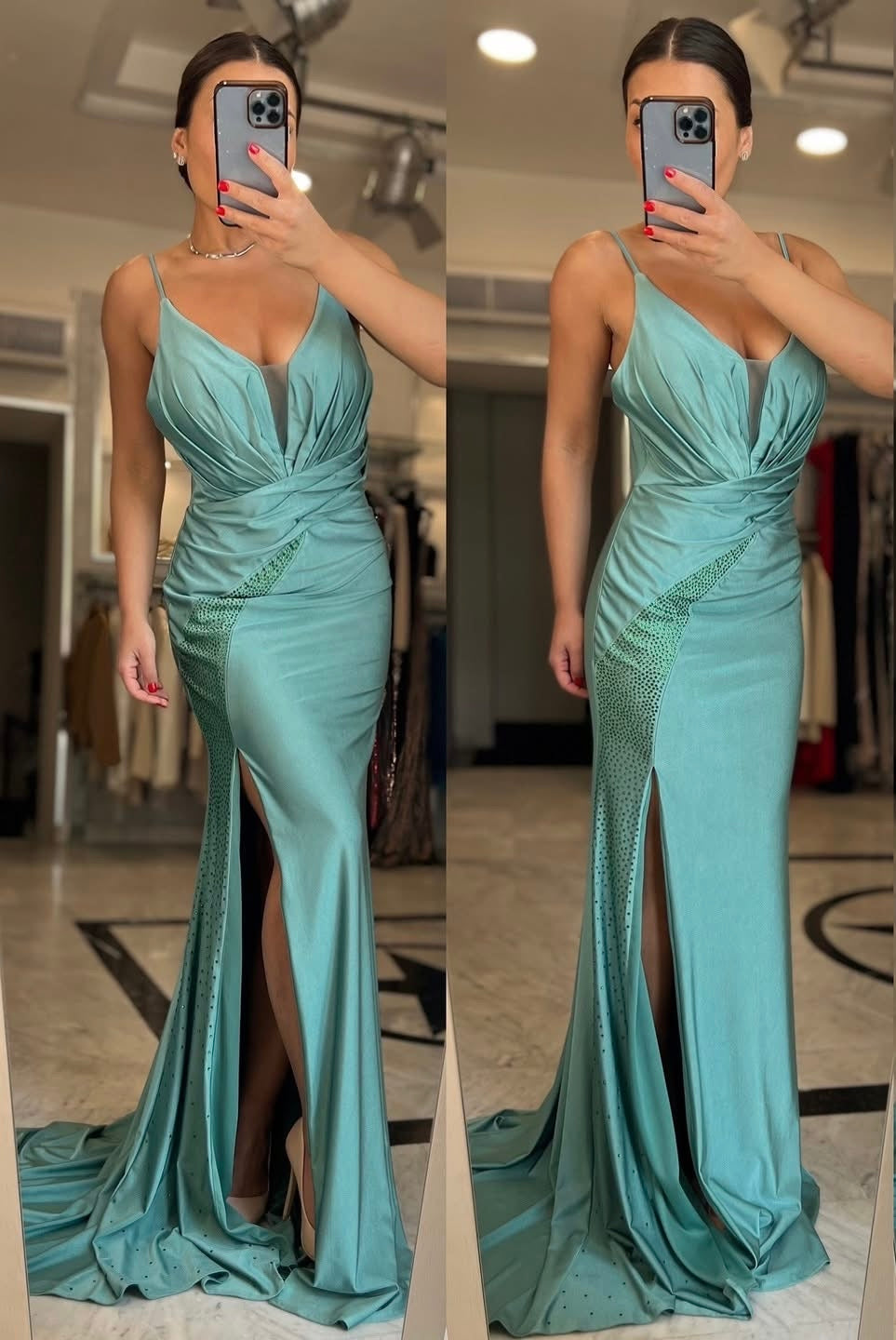 Abito lungo da cerimonia con spacco e decorazione strass. chiusura posteriore con cerniera. tessuto elasticizzato.