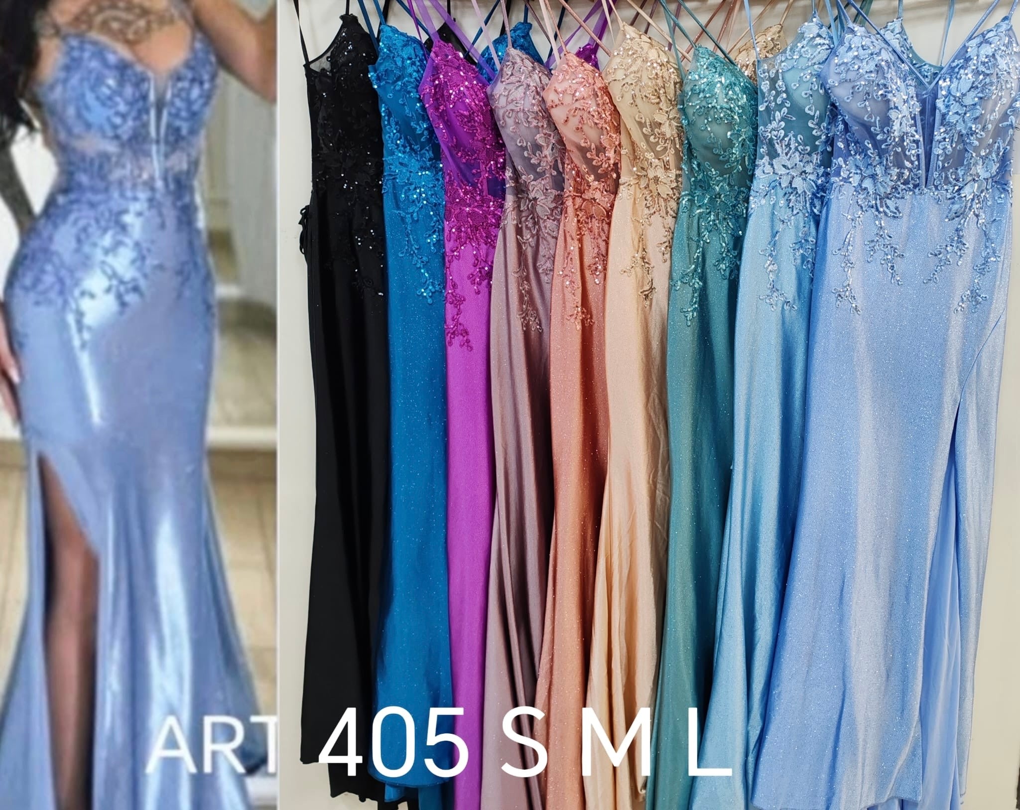 Abito lungo, elegante, da cerimonia. Taglio a sirena con spacco e corpetto con lavorazione floreale, pailliettes e trasparenze, regolabile sul retro con laccetti.