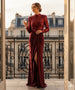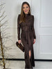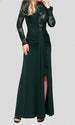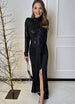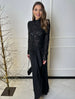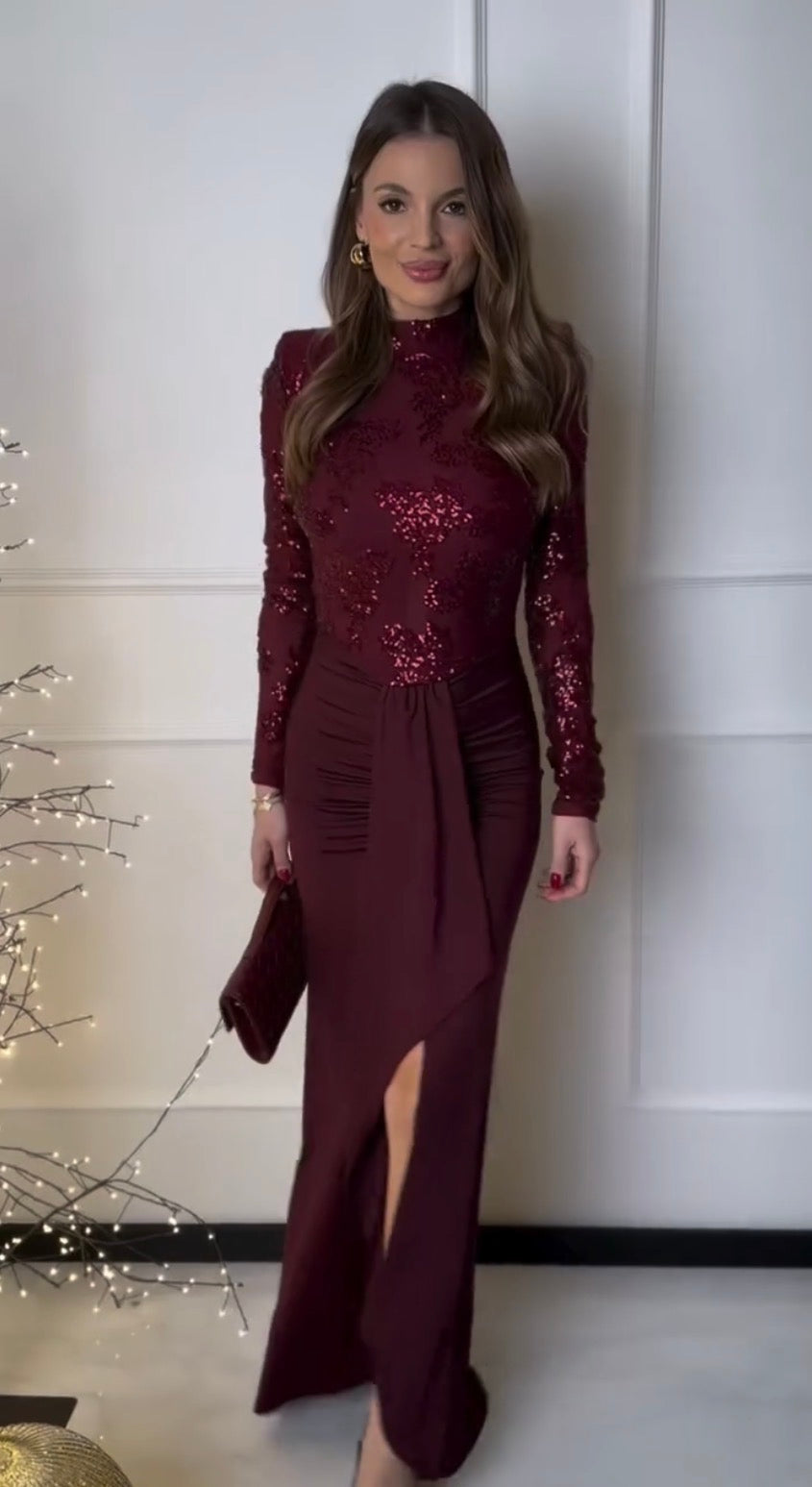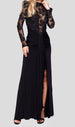Abito lungo con spacco e corpetto velato lavorato con paillettes. Sotto all’abito si può indossare l’intimo che si desidera per ovviare alle trasparenze.