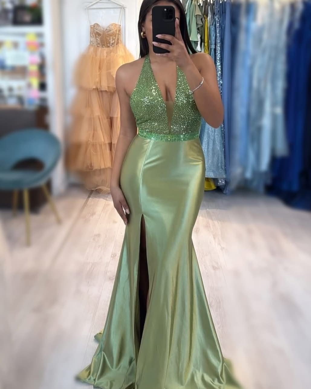 Abito lungo da cerimonia con spacco laterale con corpetto decorato on pailliettes.