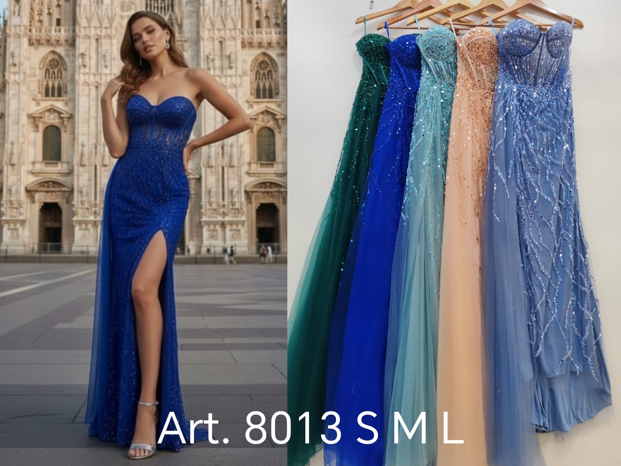• Tessuto scintillante: L'intero abito è impreziosito da glitter, paillettes o piccoli cristalli che riflettono la luce, creando un effetto "polvere di stelle".