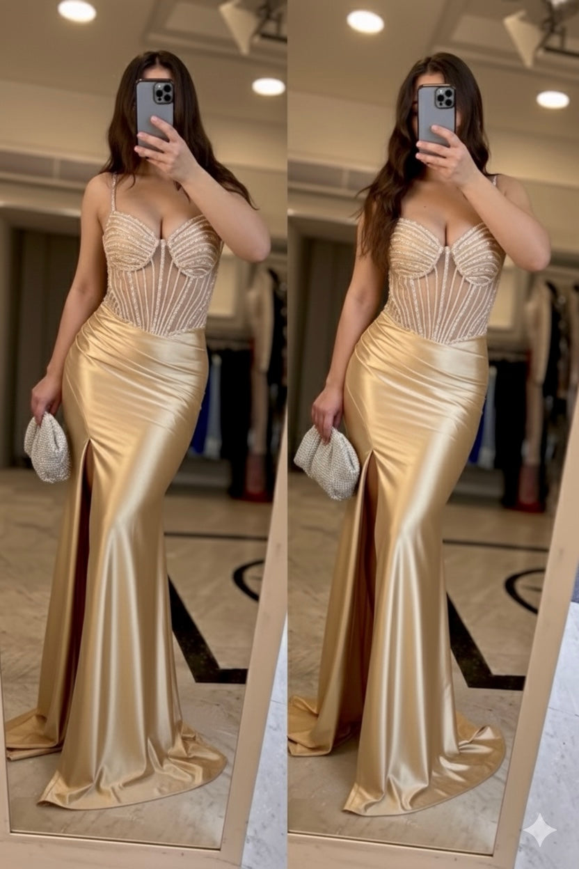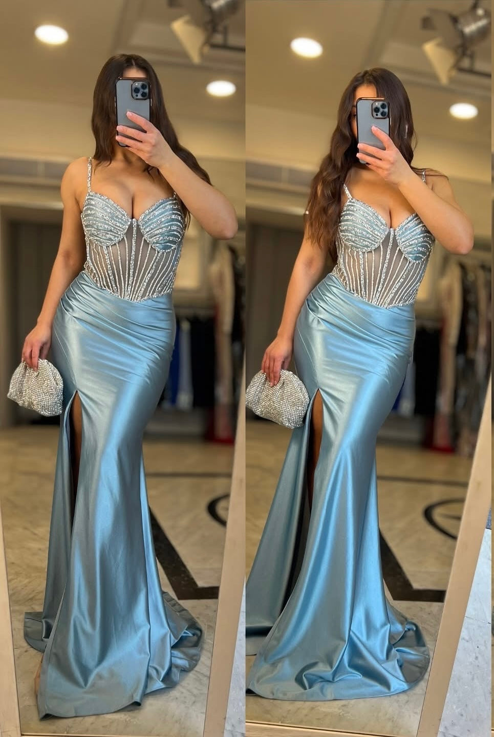 Abito da cerimonia con bustino impreziosito da strass. drappeggiato, con spacco laterale.