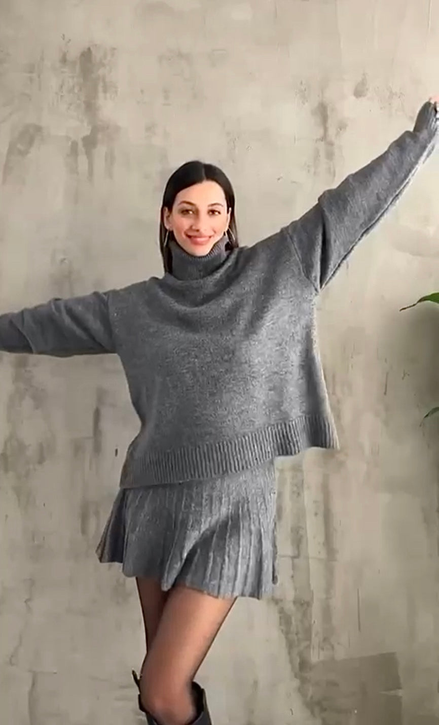 Comoleto in maglieria coordinato e comodo, caratterizzato da un maglione a collo alto e una minigonna a pieghe, offerti in una varietà di colori a tinta unita.Tessuto a maglia morbido e confortevole, adatto alle stagioni più fredde.