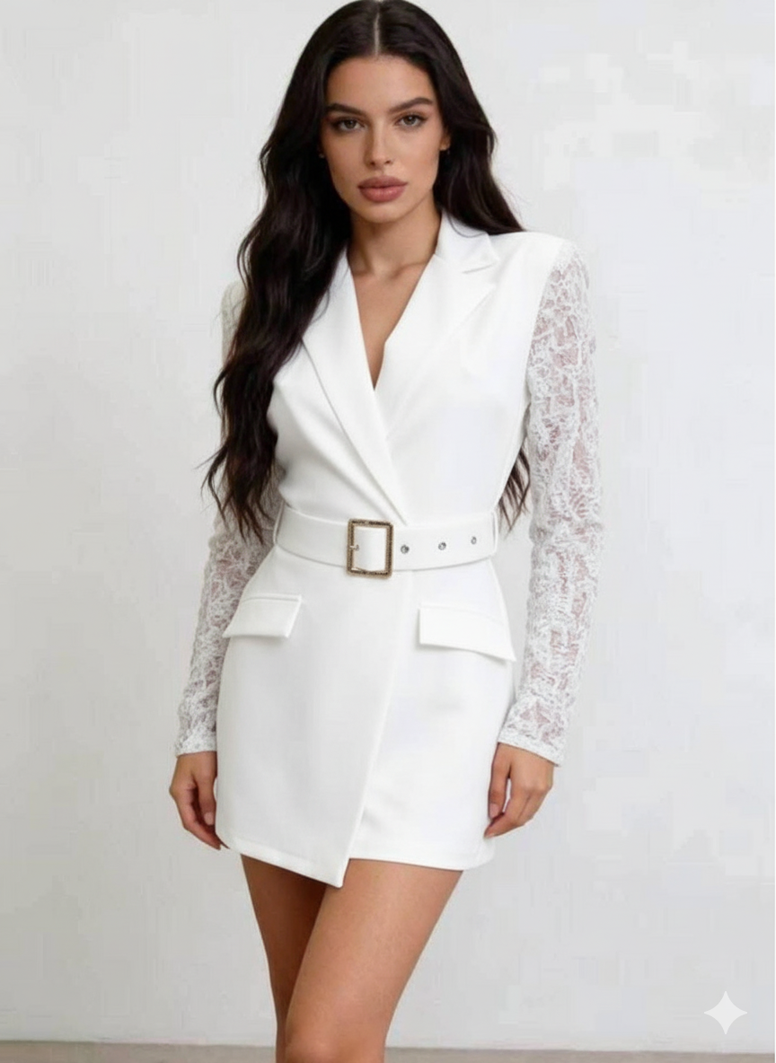 Questo abito è un vestito blazer (blazer dress) con shorts incorporati, dal design elegante e sofisticato, caratterizzato da un interessante contrasto di texture.