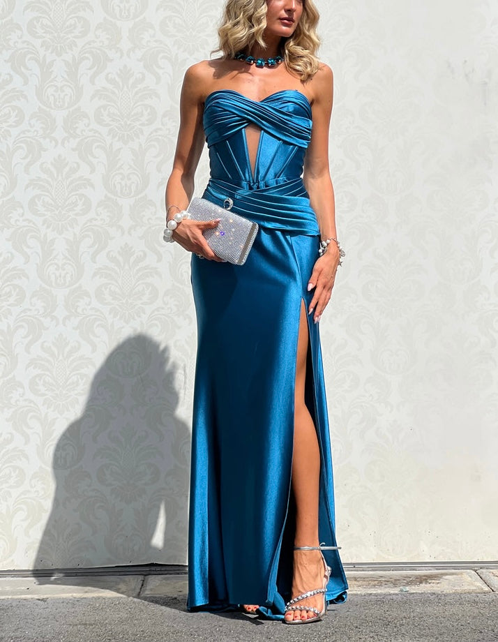 Abito lungo da cerimonia con bustino intrecciato, cut out e spacco laterale