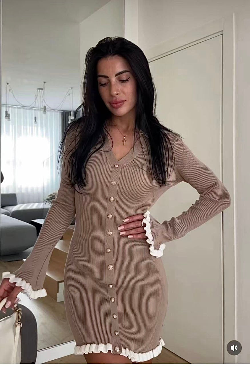 Abito in maglia elasticizzata con mini costine e merletti sull orlo e sui polsini.