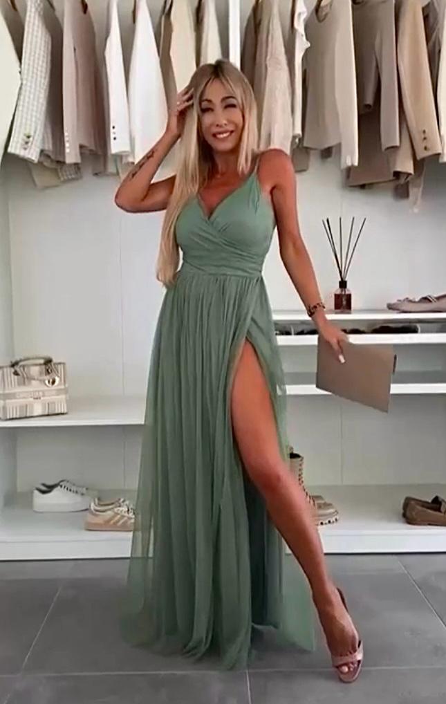 Abito in tulle con scollo incrociato drappeggiato. Elasticizzato in vita, con spacco laterale.