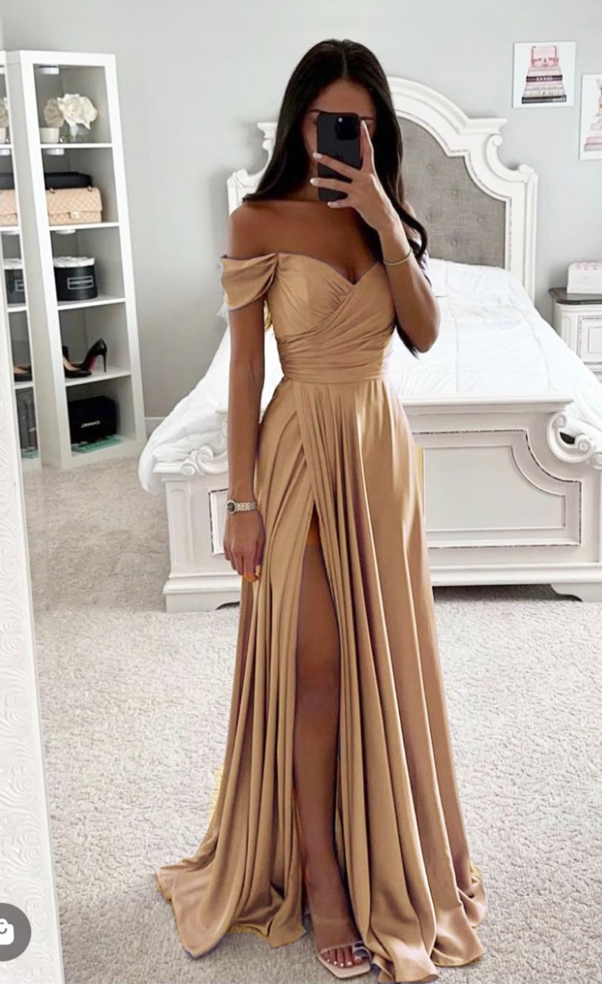 Abito lungo elegante, iridescente, con scollo cuore/barca con gonna plissettata con spacco.