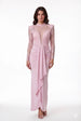• Drappeggio Centrale: L'elemento più vistoso è il drappeggio a cascata che parte dal centro della vita e scende verticalmente, aggiungendo movimento e volume alla figura.