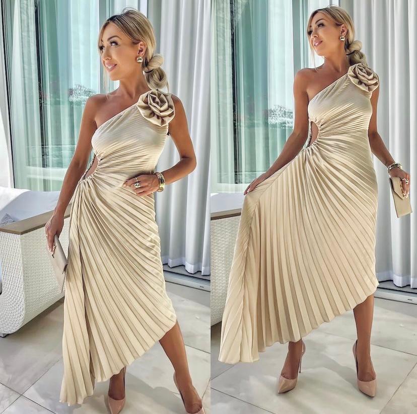 Abito monospalla, asimmetrico, plissettato con cut out e applicazione rosa.