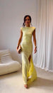 • Drappeggio (Ruched): L'abito è interamente caratterizzato da una fitta arricciatura orizzontale (ruching) lungo il corpo e sui glutei. Questo dettaglio non solo crea movimento nel tessuto, ma aiuta anche a modellare visivamente le forme.
