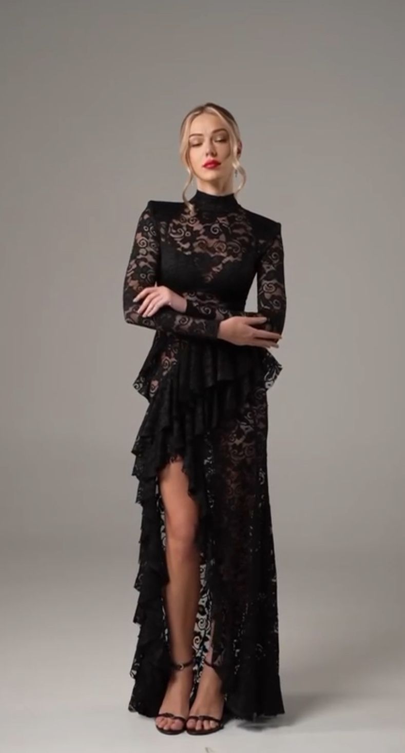 Abito elegante, lungo,accollato, lavorato in pizzo, con spacco laterale.