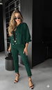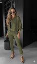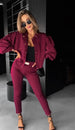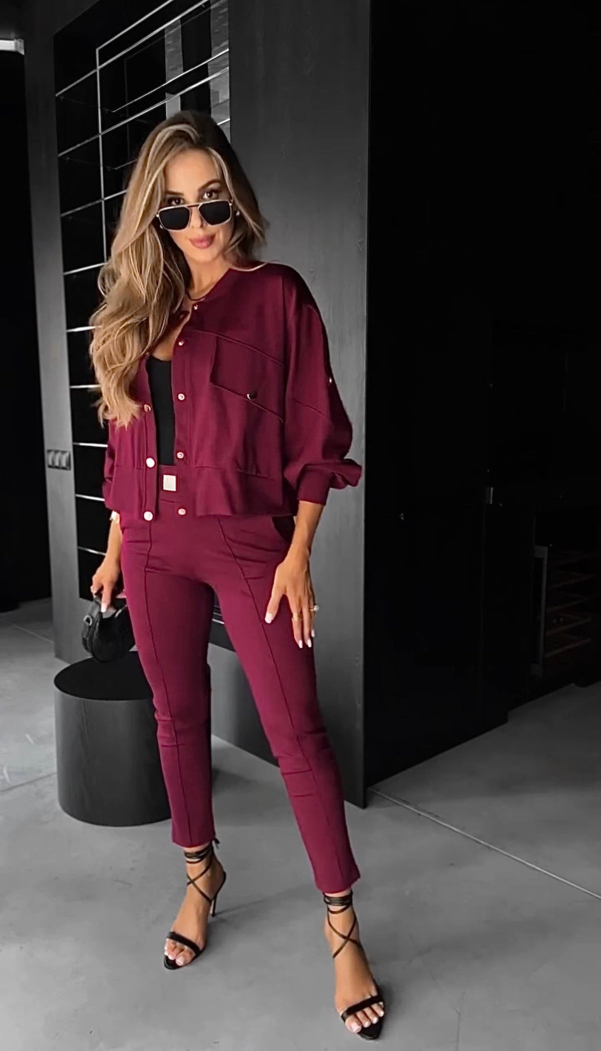 Completo composto da Giacca/Camicia, un capo simile a una giacca bomber corta o una camicia strutturata con un taglio squadrato e maniche lunghe.Presenta tasche applicate sul petto.Ha bottoni dorati che creano un contrasto cromatico. I pantaloni sono dello stesso colore e tessuto, hanno un taglio aderente o slim-fit e terminano alla caviglia.