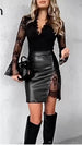 • Gonna in Ecopelle: Una mini gonna a vita alta in similpelle nera. Il dettaglio distintivo è lo spacco laterale che rivela un inserto in pizzo coordinato con il top, creando una continuità visiva in tutto l'abito.