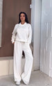 • Pantaloni: Pantaloni a gamba larga (wide-leg) coordinati, con vita elasticizzata e coulisse bianca a contrasto.