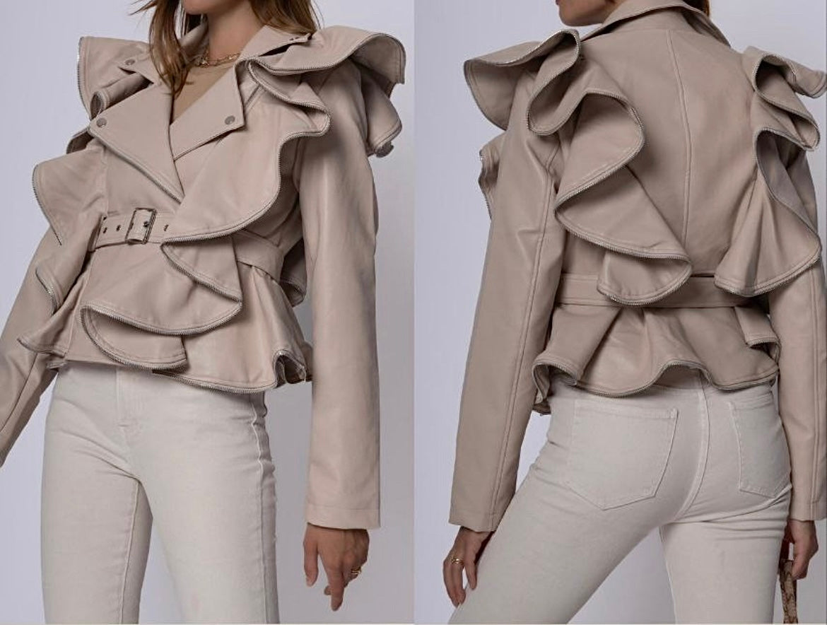 Giacca in ecopelle con rouches, chiusura con zip e dotata di cintina