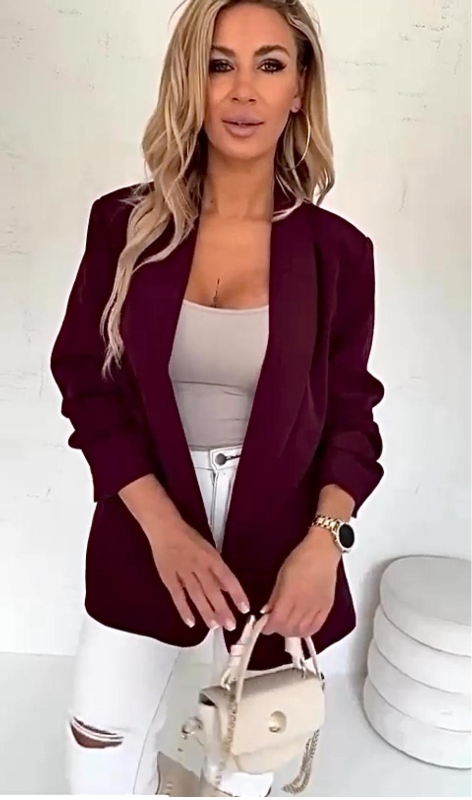Giacca tessuto scuba crepe in tinta unita. Rever sciallato, spalline interne imbottite, manica arricciata con drappeggio e tasche estetiche. Glamour, si adatta ad una varietà di occasioni, per una mise classy e versatile.